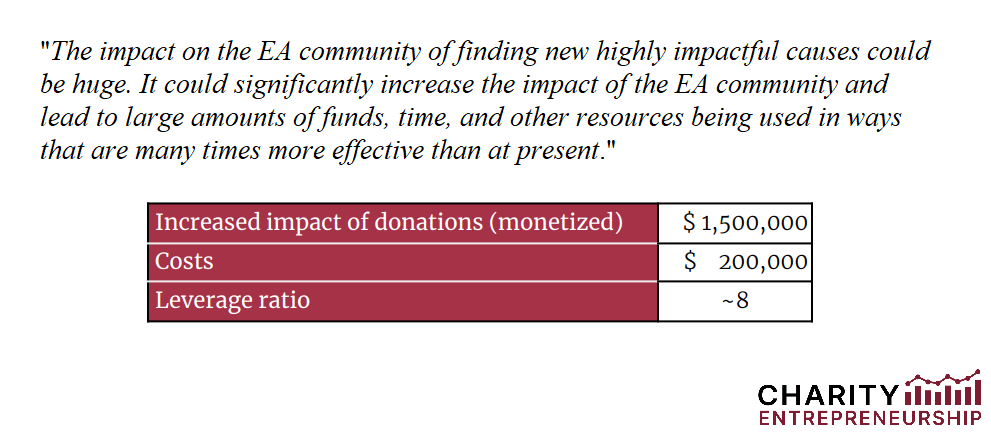 - In any case, one might – and indeed, should – be sceptical of an organization’s evaluation of its own cost-effectiveness. However, an independent evaluation by Charity Entrepreneurship expects an exploratory altruism charity like CEARCH to be about 8x as cost-effective as existing top EA causes (link).